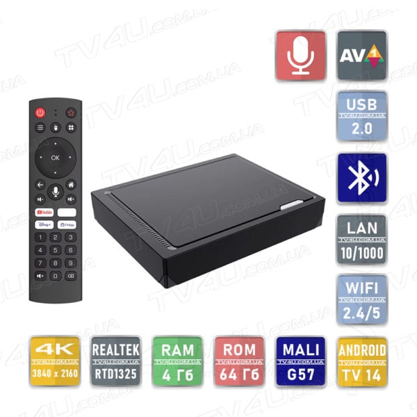 Vontar RT-X2 4/64 Гб работает на ОС Android TV 14 , разработанная специально для телевизоров и медиаприставок. Операционная система имеет более обычный интерфейс и полностью адаптирована под работу с пультами. Преимущества перед обычным Android: большие иконки, рекомендации по YouTube и онлайн кинотеатрам на главном экране, интегрированное голосовое управление.